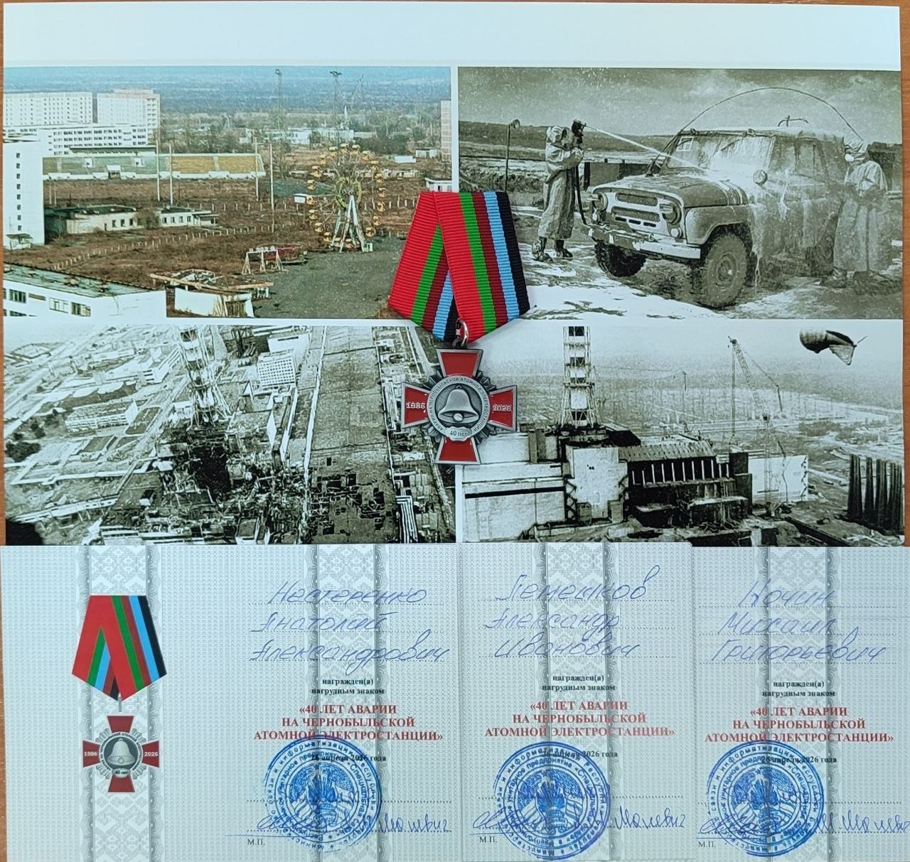 Today, on the eve of the 40th anniversary of the tragedy at the Chernobyl nuclear power plant, the republican unitary enterprise "Special Communications" honored the liquidators of that terrible accident, Ivan Vladimirovich Gonchar, Sergey Anatolyevich Bely, employees of the Minsk Special Communications Workshop, Mikhail Grigoryevich Kochin, an employee of the Gomel Special Communications workshop, and Anatol Nesterenko, former employees of the Gomel Special Communications Workshop. Alexander Alexandrovich, Alexander Ivanovich Lemeshkov.